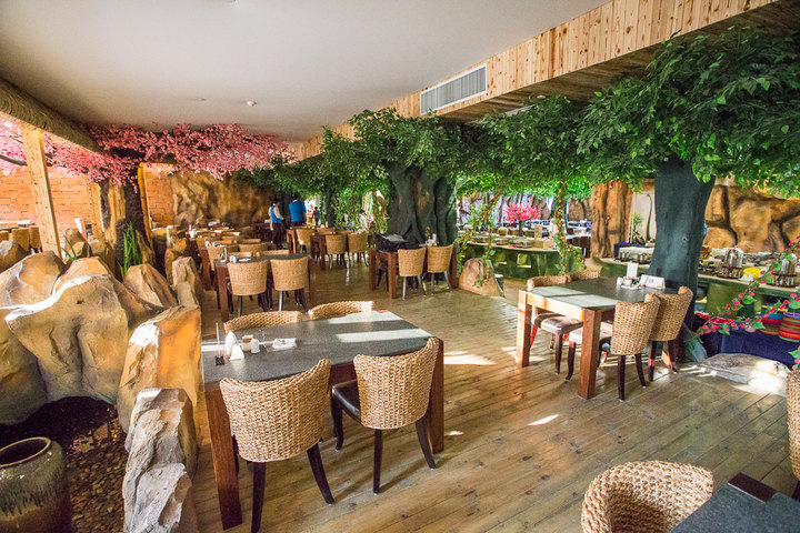 酒店全部是恐龙主题的,入口是恐龙洞穴,还有各种恐龙的模型,细节处也做得很好,干净高档。 酒店有自助早餐,环境不错,在森林里面,还有专门为孩子们准备的早餐和各类餐具。
